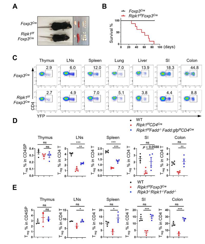 Figure 1. Treg细胞特异性敲除RIPK1导致致死性的系统性自身免疫反应