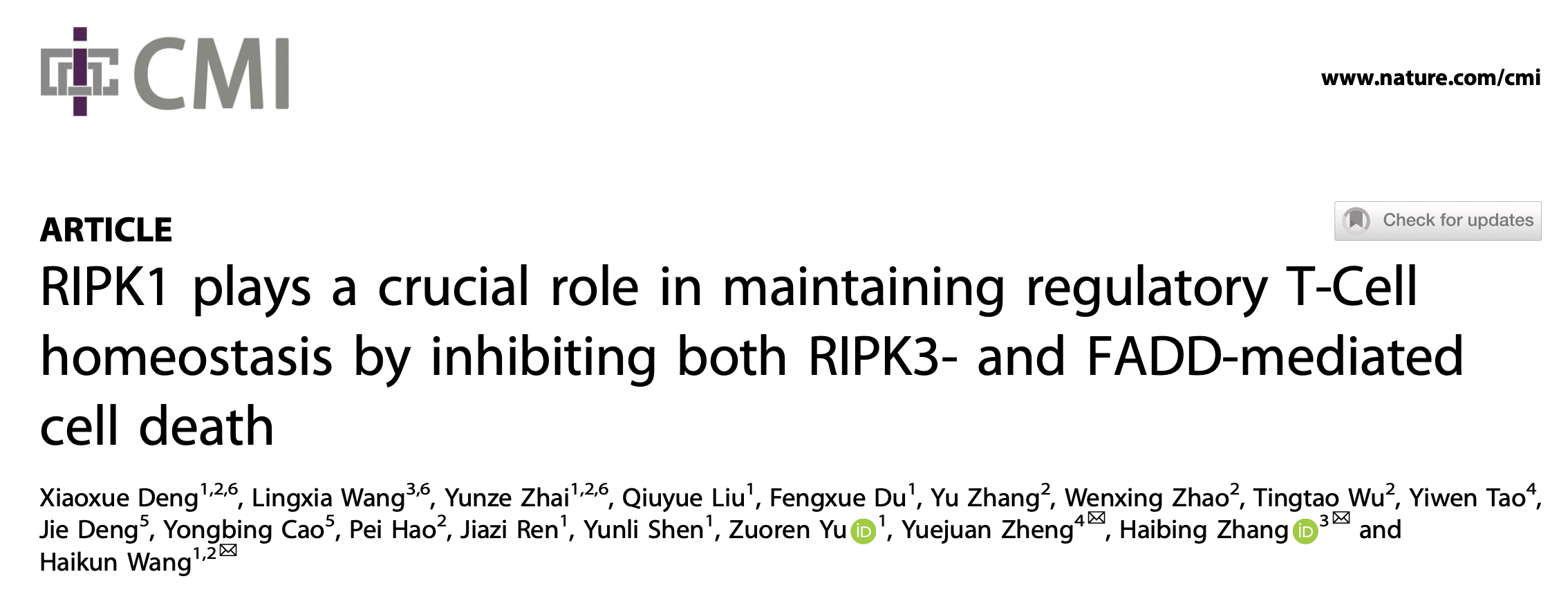 国际著名学术期刊Cellular & Molecular Immunology(SCI 1区,IF=24.10)在线发表了无码av影片 郑月娟课题组与同济大学附属东方医院王海坤课题组、中国科学院章海兵课题组合作的研究论文“RIPK1 Plays a Crucial Role in Maintaining Regulatory T Cell Homeostasis by Inhibiting both RIPK3 and FADD-Mediated Cell Death”,该研究发现受体相关蛋白激酶1(receptor-interacting protein kinase 1,RIPK1)在维持Treg细胞和常规CD4+ T细胞(Tconv)的稳态的机制不同,Treg细胞中RIPK1蛋白通过抑制FADD和RIPK3介导的凋亡和坏死促进Treg细胞的存活,而在常规CD4+ T细胞中,RIPK1主要通过抑制凋亡促进 CD4+ T细胞的存活。