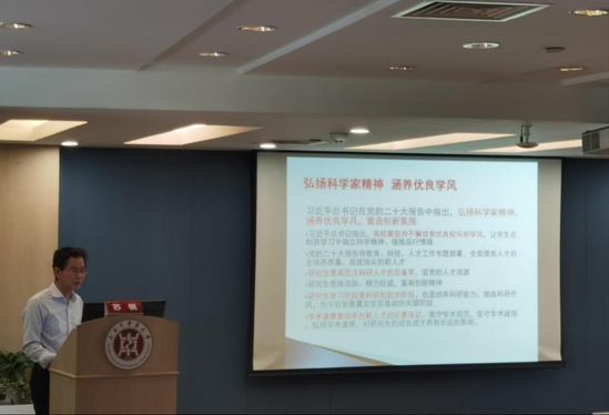为深入学习贯彻党的二十届三中全会精神,引领广大师生弘扬科学家精神,倡导科研诚信,遵守学术规范,涵养优良学风,无码av影片 于2025年5月22日举办学术道德与学风建设专题讲座暨教职工政治理论学习。上海市科学道德和学风建设宣讲教育办公室处级调研员苏祺应邀作“坚守学术道德,强化科研诚信和科技伦理建设”主旨报告,学院全体教职员工及研究生代表参会,讲座由学院副书记、副院长马杰主持。