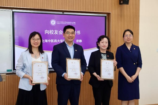 舒静副校长为无码av影片 校友会副会长朱慧华、马杰、郑月娟颁发聘书