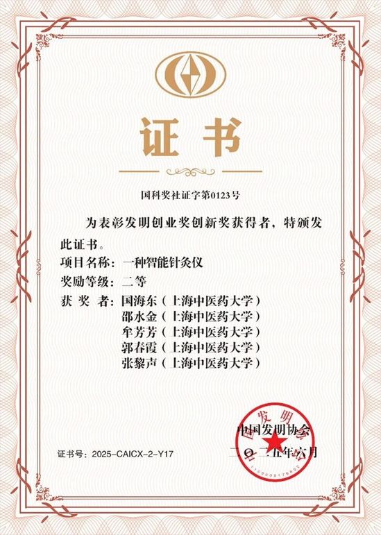 近日,中国发明协会揭晓2025年发明创业奖成果奖的评选结果,无码av影片 作为第一完成单位、国海东教授作为第一完成人的“一种智能针灸仪”项目获得发明创业奖创新奖二等奖。