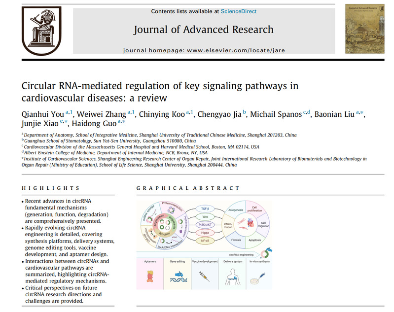 近日,我校无码av影片 国海东教授团队、刘宝年团队联合上海大学肖俊杰教授团队,在国际知名学术期刊Journal of Advanced Research发表题为“Circular RNA-mediated regulation of key signaling pathways in cardiovascular diseases: a review”的论文,总结了环状RNA的生命周期、工程学应用潜力,以及其在调控心血管疾病核心信号通路中的研究现状,为该领域研究提供参考的同时,也针对当前心血管疾病治疗面临的分子机制瓶颈,探讨了基于环状RNA的未来探索方向。