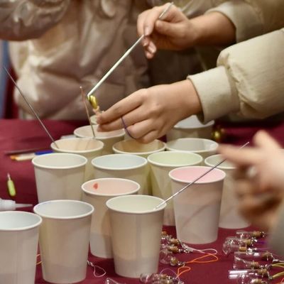 在“新岁-百草愿”摊位前,同学们专注制作中药创意冰箱贴,将药材巧妙排列,方寸之间尽显心意。