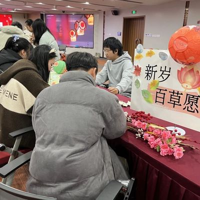 同学们在“新岁百草愿”摊位前俯首执笔,将新年心愿落于纸端,小小便利贴承载着对未来的憧憬,为游园会增添了一抹温馨的色彩。