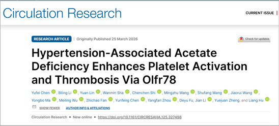 近日,心血管领域国际权威期刊、美国心脏协会(AHA)旗舰期刊Circulation Research在线发表了我院胡亮研究员团队的最新研究成果:《Hypertension-Associated Acetate Deficiency Enhances Platelet Activation and Thrombosis via Olfr78》。该研究首次阐明了高血压血瘀证发生发展的微观分子机制,为 “五谷为养” 的经典养生与防治理论提供了科学证据。